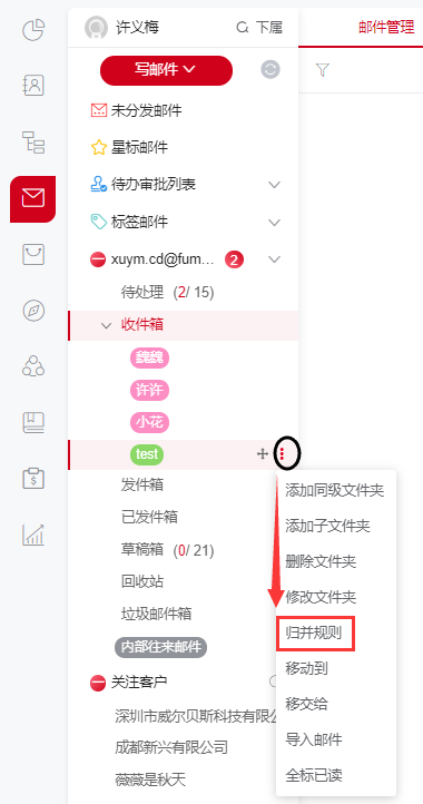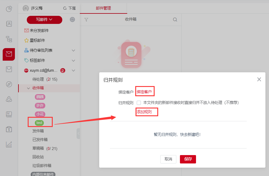 归并规则有两种方式,第一,绑定客户,选择已建档的客户,该客户的收发件会对应收到此文件夹(建档客户的所有邮箱地址都会绑定)
