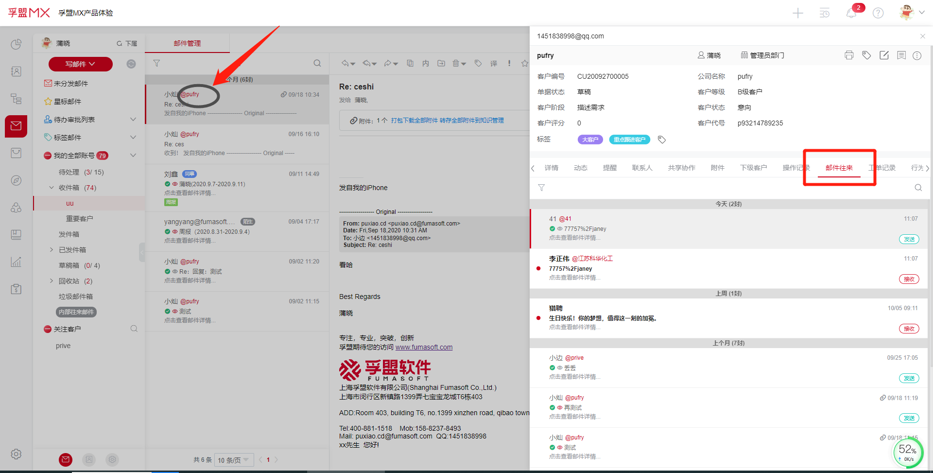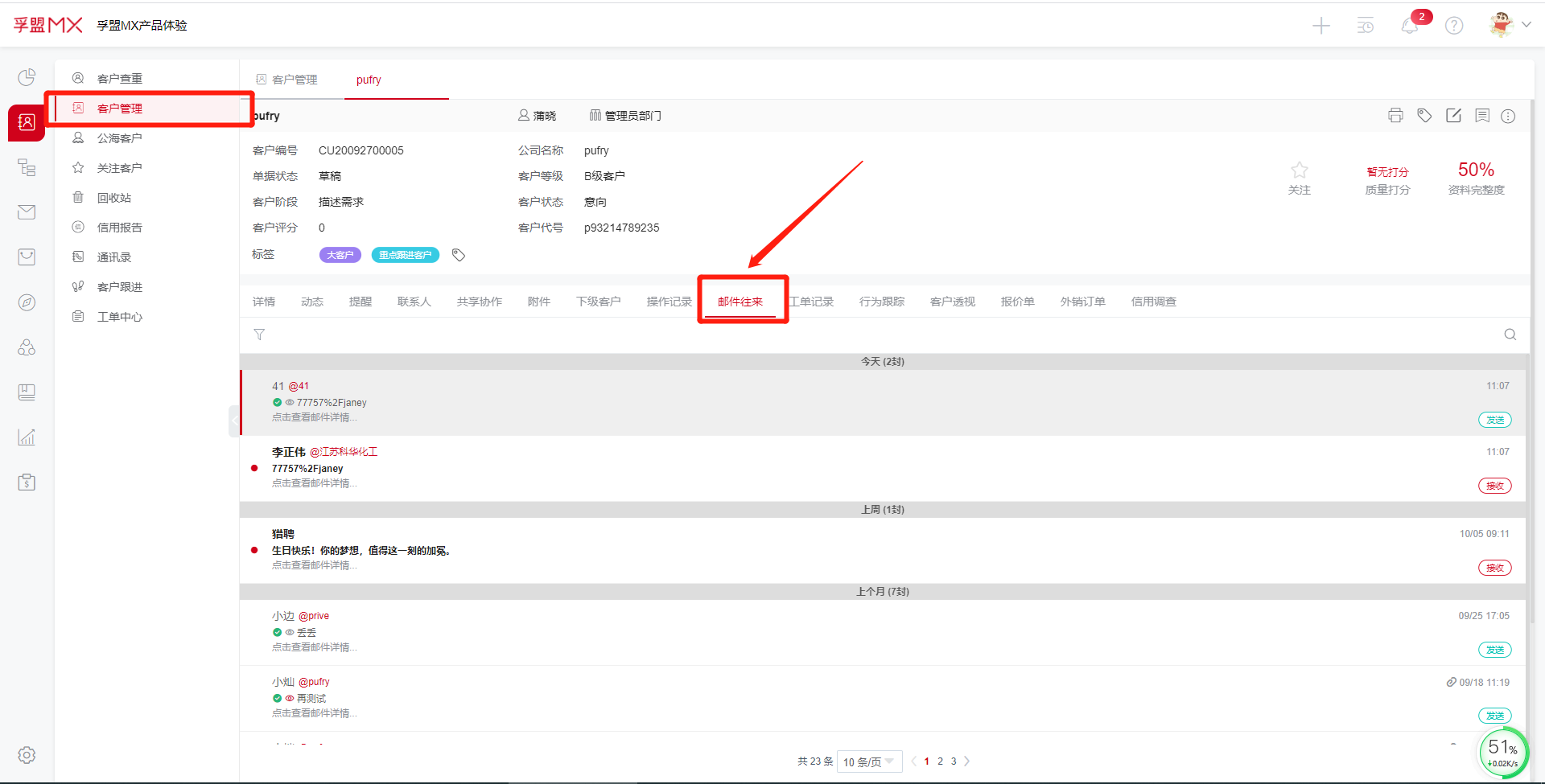客户模块:在客户管理里点击客户名称,进入客户详细信息里查看邮件往来