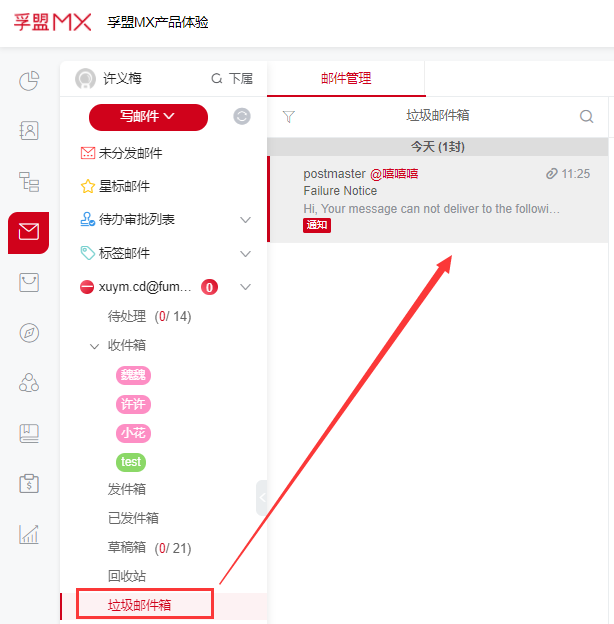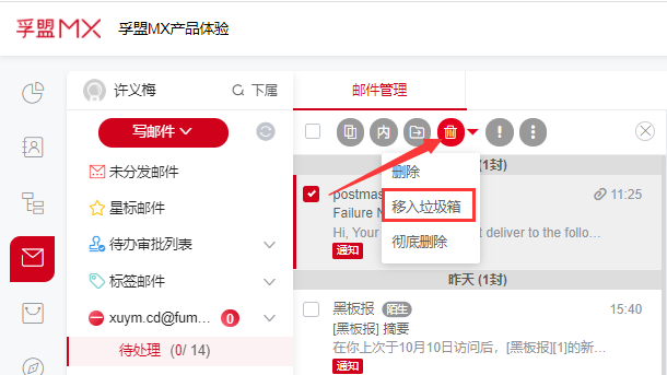 第一,通过邮件手动移入垃圾箱,比如选择邮件,点击上方的菜单栏的移入垃圾箱,到垃圾邮件箱查看刚移动的邮件