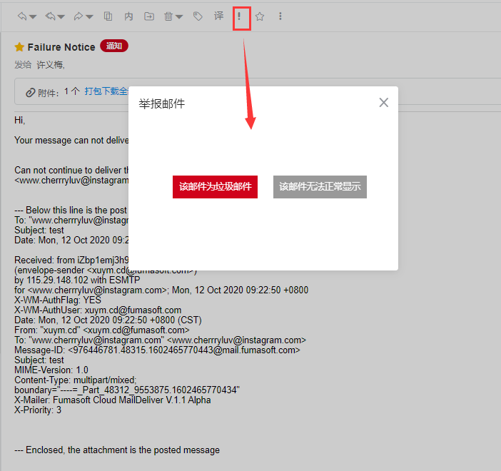 第二,通过邮件地址移入垃圾箱,打开邮件内容的菜单栏,点击灰色感叹号小图标,触发弹框,选择该邮件为垃圾邮件后,将地址加入黑名单以及该地址的所有邮件移入垃圾箱,将邮箱地址加入黑名单会接收不到此邮箱地址发送的所有邮件