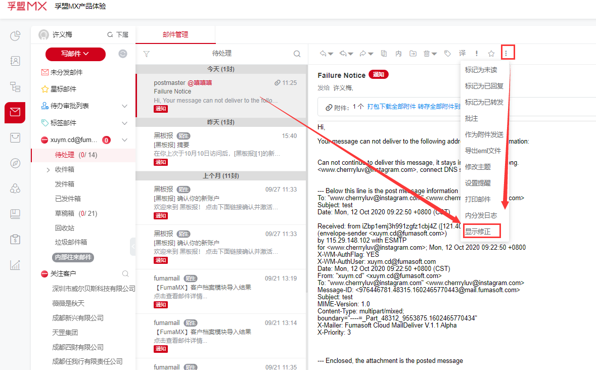 打开显示异常的邮件,单击上方菜单栏的“显示修正”,刷新查看邮件是否正常,若邮件还是显示异常,请联系相应的售后服务人员