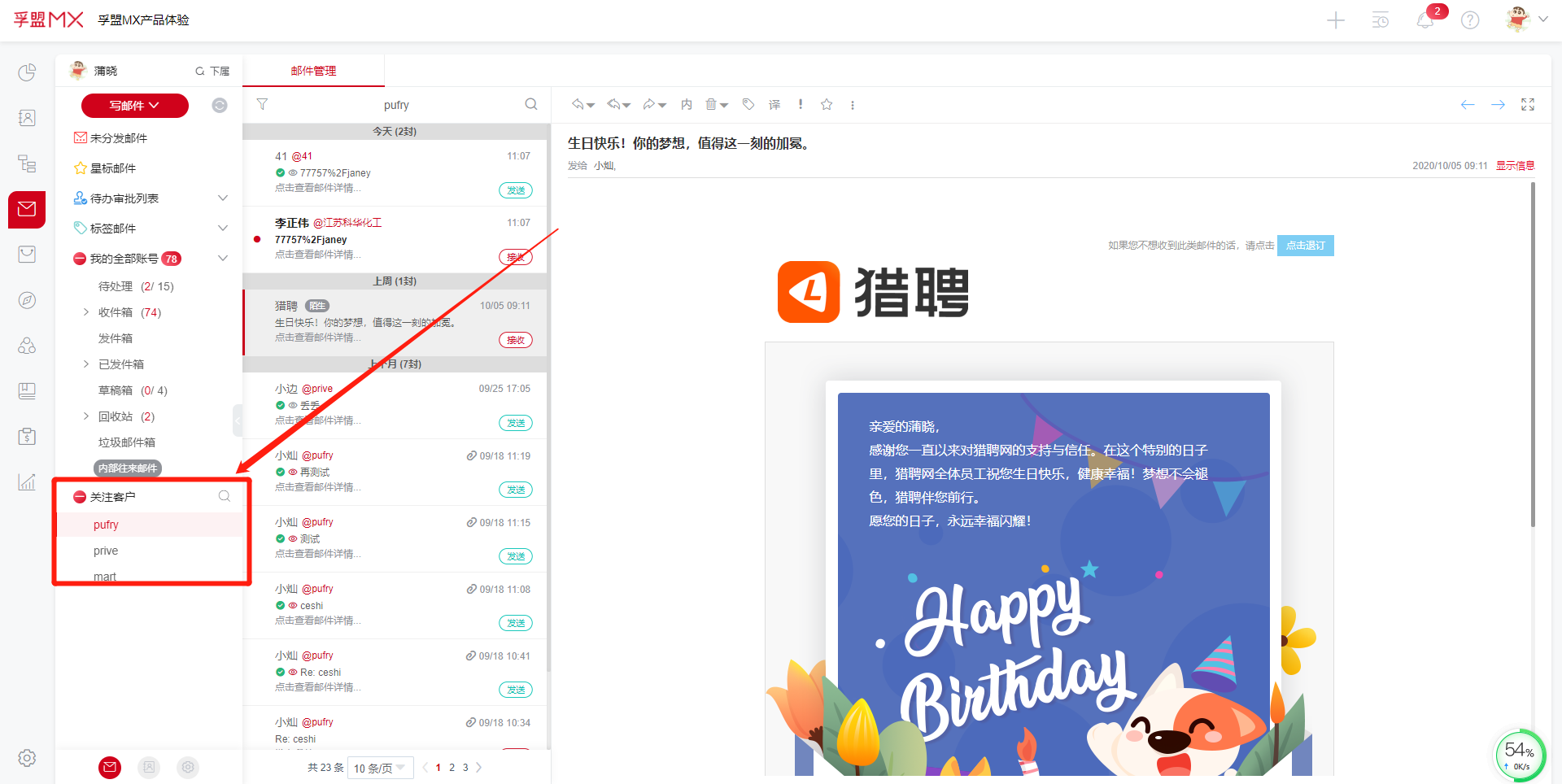 邮件模块:关注该客户后,自动建立客户邮件文件夹,其中文件夹内邮件为关于该客户的往来邮件