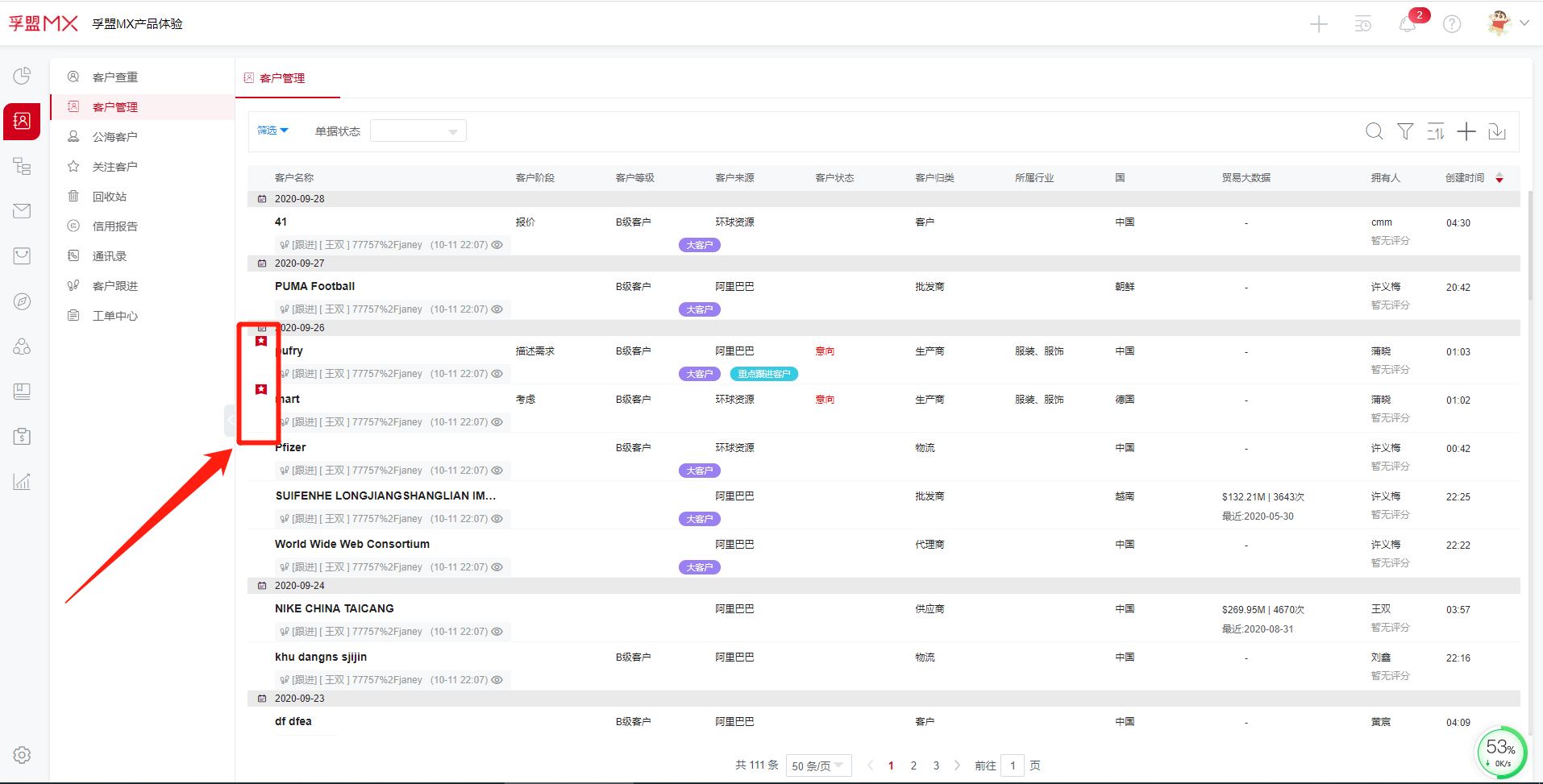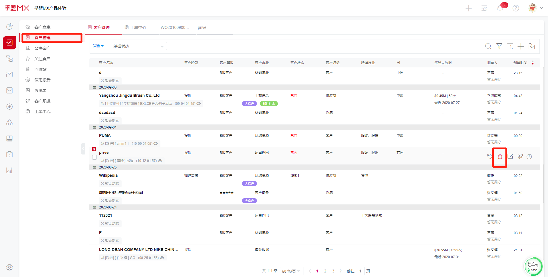 客户模块:关注客户后,客户信息会有星标标记,在关注客户里面可以看到所有被标记的关注客户