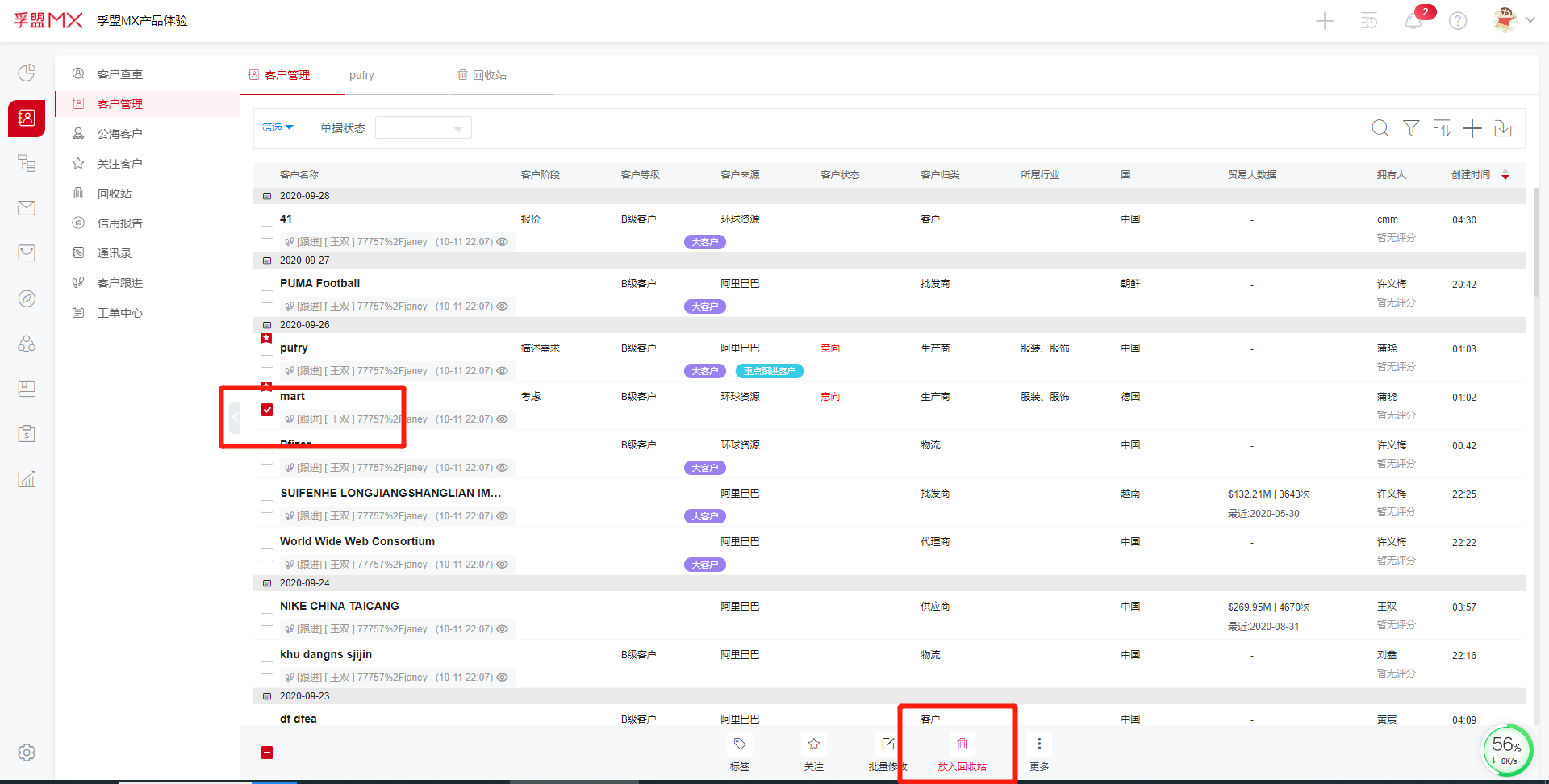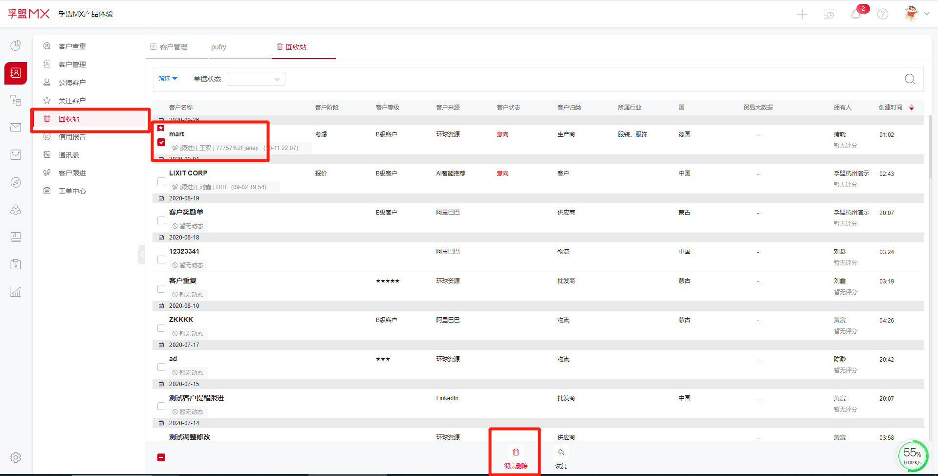 放入回收站就是将客户从客户列表里删除了,该条客户信息就自动移到回收站处,但注意,放入回收站里的客户不是彻底删除,如果再次新建同一个客户信息会显示重复,此时需彻底删除该客户,应在回收站里去选择彻底删除。