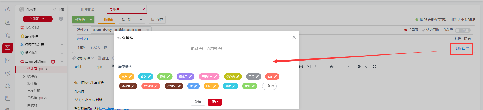 1、写邮件时,单击打标签按钮,可设置标签,也可清除标签。