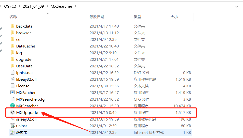 旧的安装文件解压出来名称太长不能识别更新,删掉多余的部分,只保留"MXSearcher",重新打开获客宝看是否更新