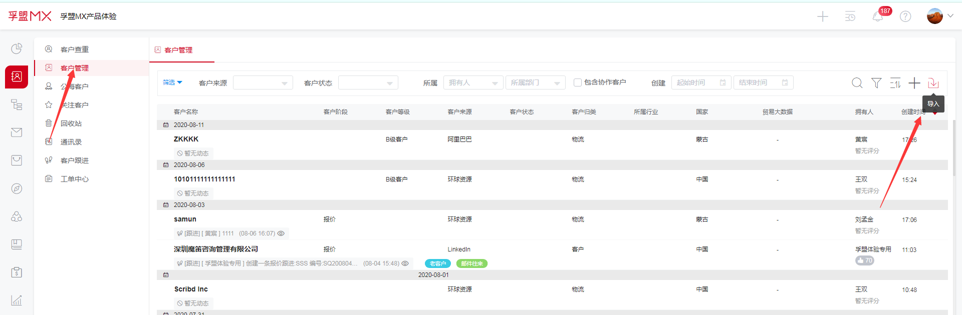客户导入需要下载MX中企业的模板,将信息填入模板中再执行导入。 下为图文步骤 1.首先在客户管理界面点击导入