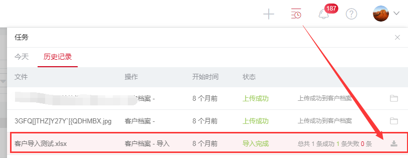 4.导入完成后,可在右上角任务栏下载导入结果,失败的可以查看失败原因,修正后重复上述步骤导入即可