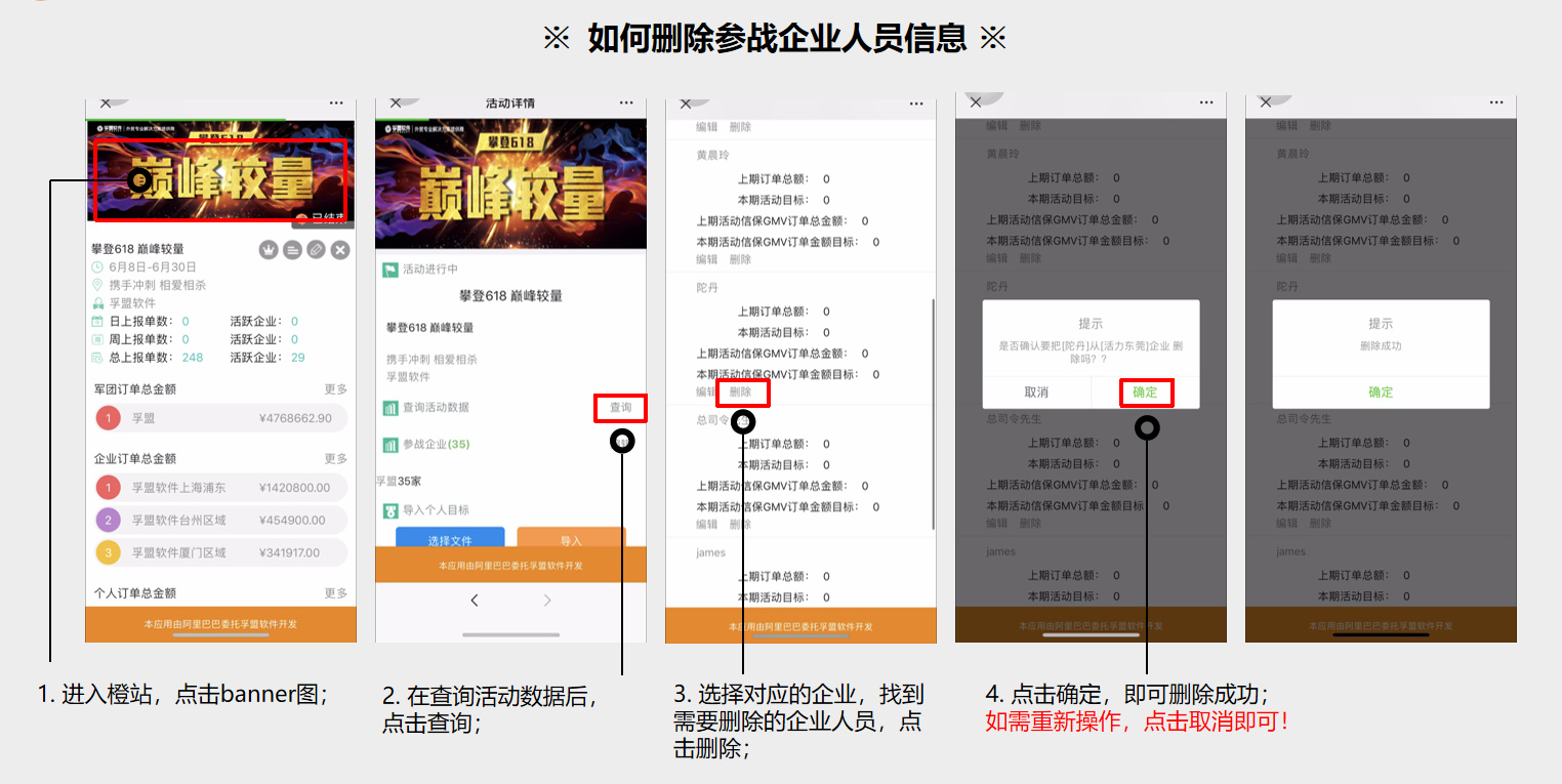 1、微信扫发起方后台二维码或PC端网址进入后台 2、找到活动banner图,点击banner图 3、点击查询 4、点击对应的企业名称 5、进入找到需要删除的人员 6、点击删除,如需重新操作,点取消即可 7、点确定即删除成功 如图: