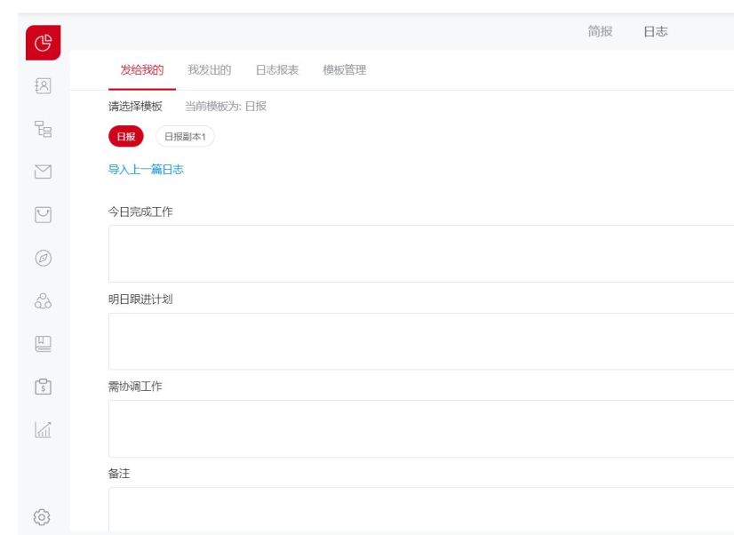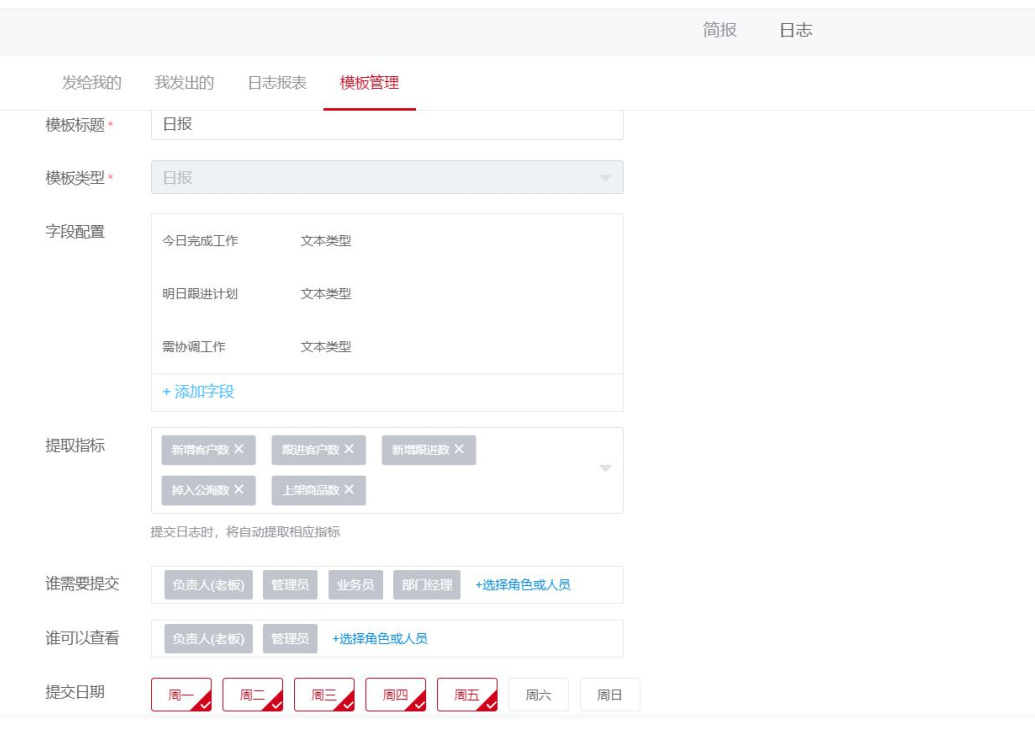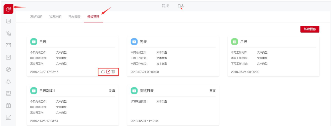 1、 日志模板管理, 复制、 编辑和删除系统默认模板。 系统默认提供日报、 周报以及月报模板, 可以直接使用。 如果有需要特殊修改, 可以进行编辑后新增字段。