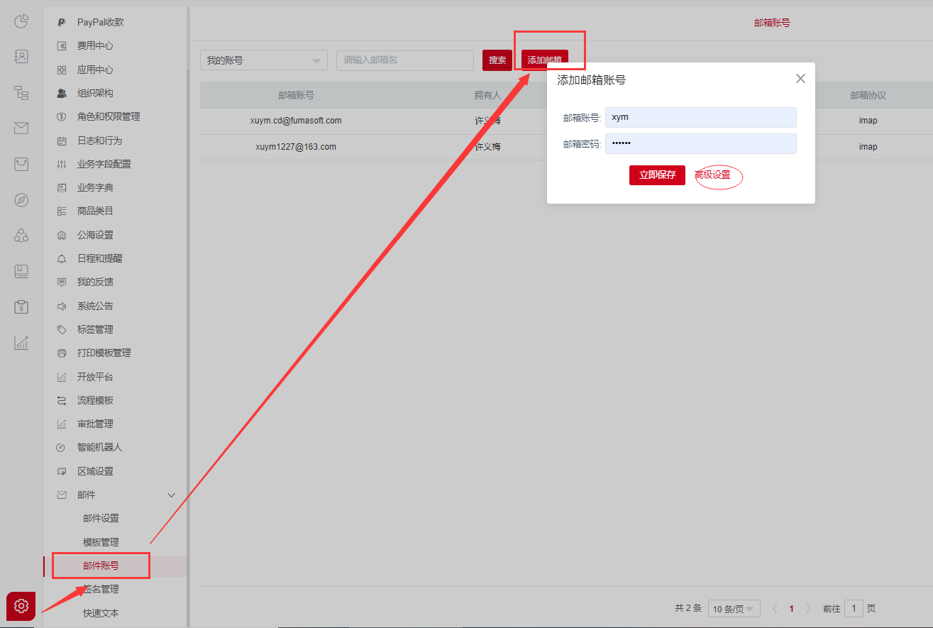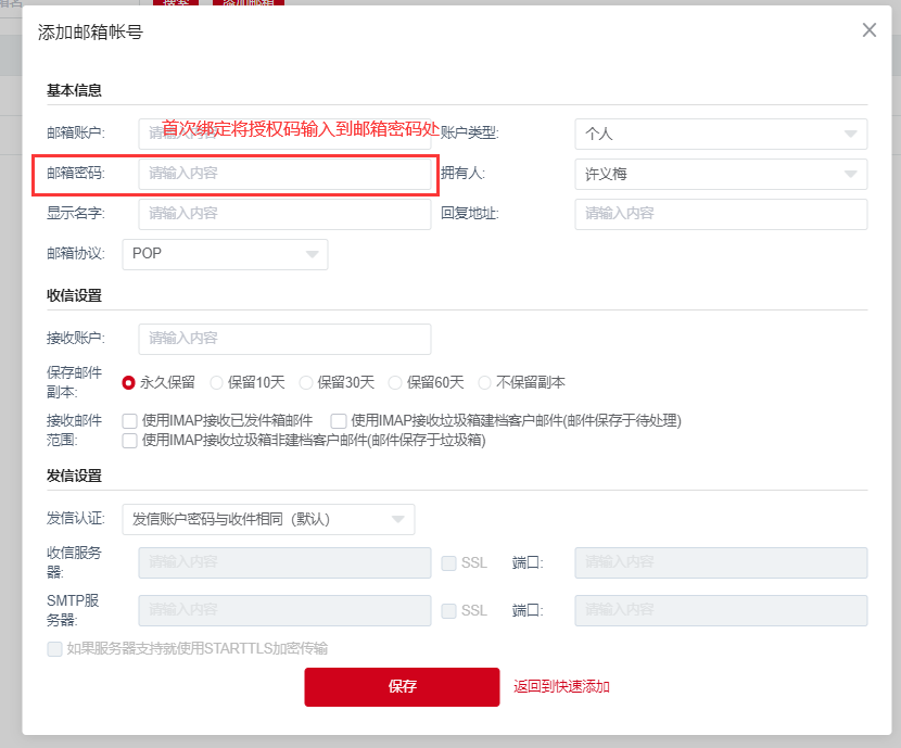 2、或者点开高级设置进行添加,若是首次绑定邮箱账号,需从企业邮箱获取授权码并填入密码栏保存。