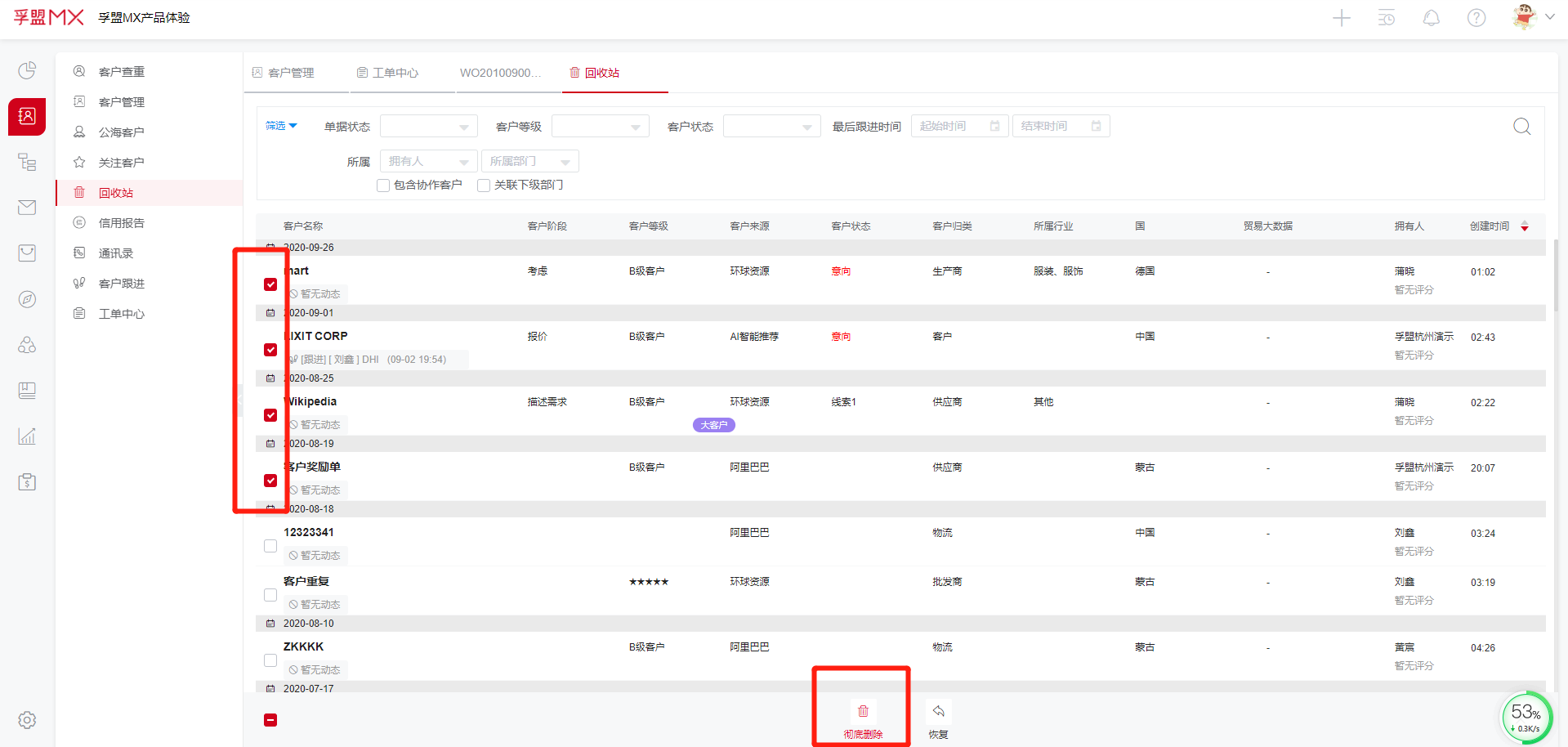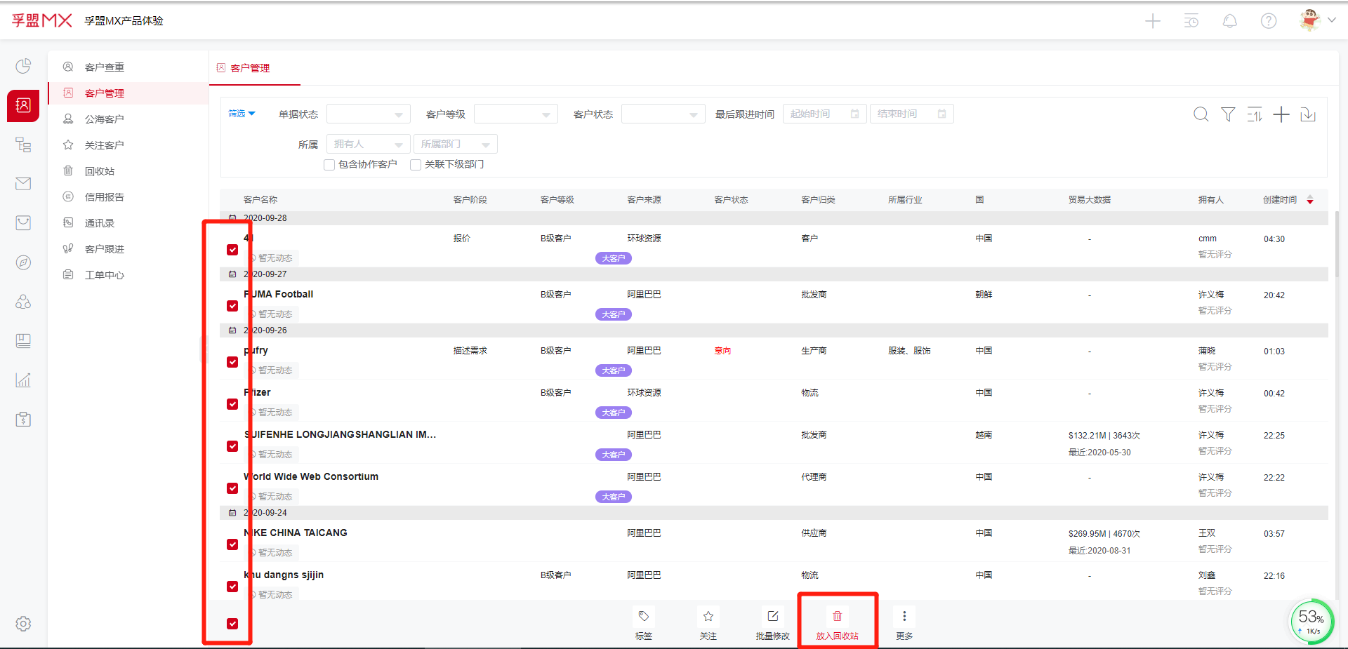 批量删除客户: 在客户管理模块,先勾选需要删除的客户,点击放入回收站即可。