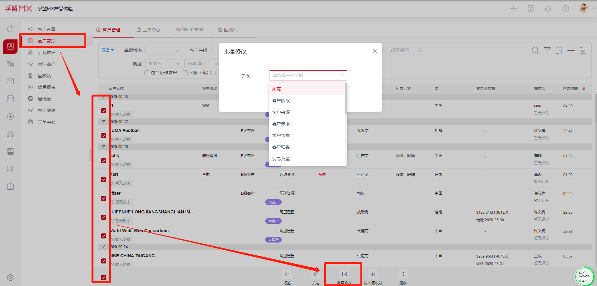 批量修改客户: 在客户管理模块,先勾选需要修改的客户,点击批量修改,修改相应字段信息即可。