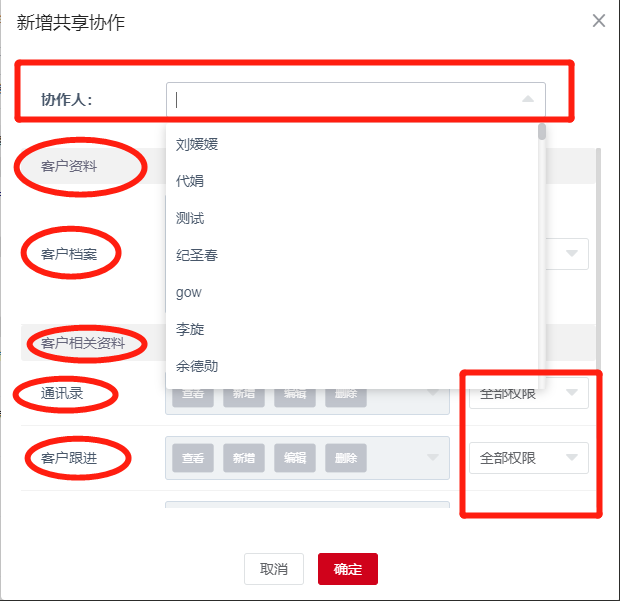 注:在选择共享协作人时,可以设置被共享对方关于该条客户信息操作的相关权限。(共享客户档案,联系人,跟进,邮件)