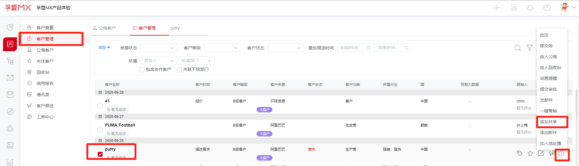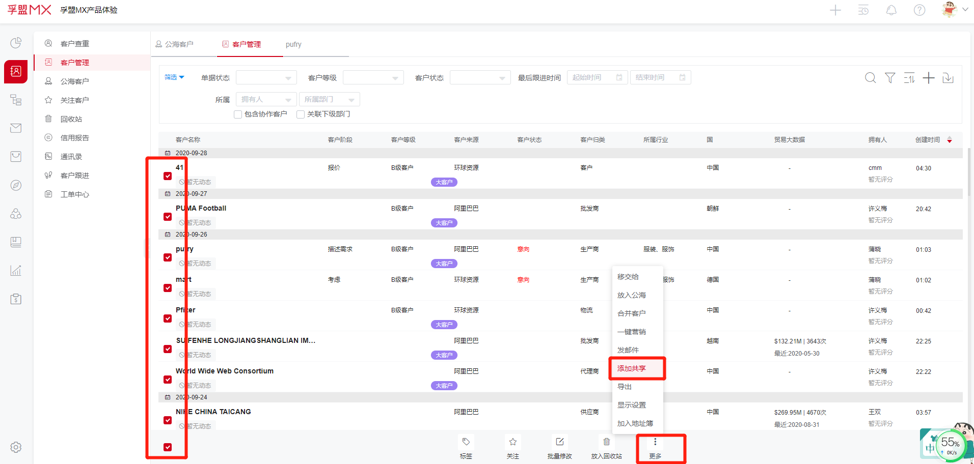 2、批量客户共享:在客户管理模块,勾选需要共享的客户,选择下面的更多,可添加共享。