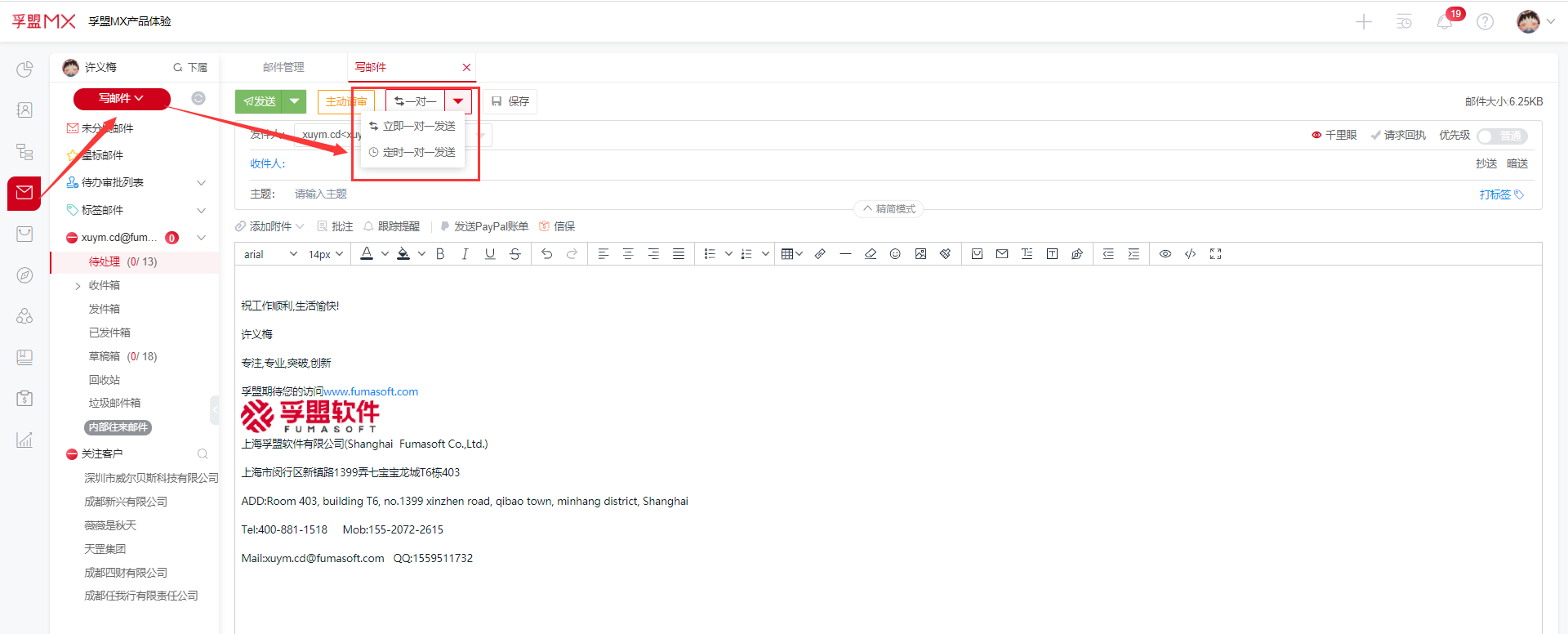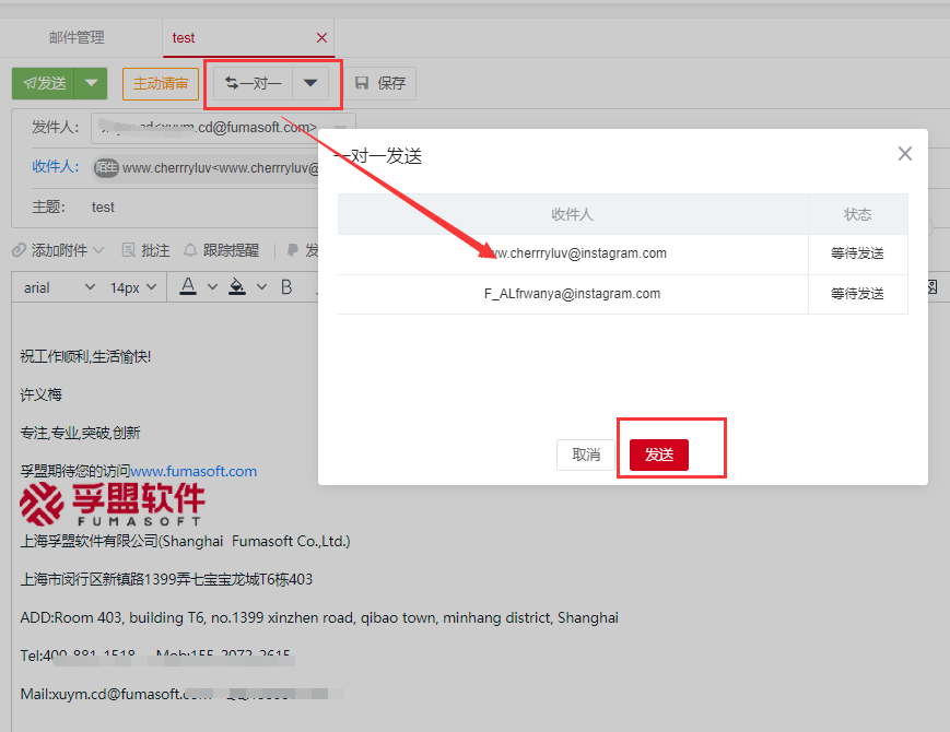 2、编辑好邮件内容、主题后,点击一对一按钮,选择立即一对一发送或即时一对一发送,设置发送时间