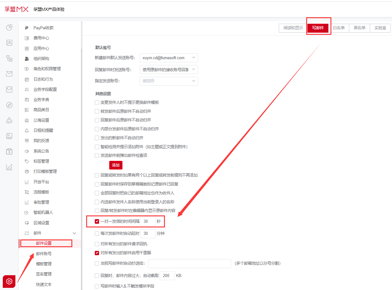 1、邮件设置处设置一对一发送的时间间隔(根据自己的实际需求情况而定)
