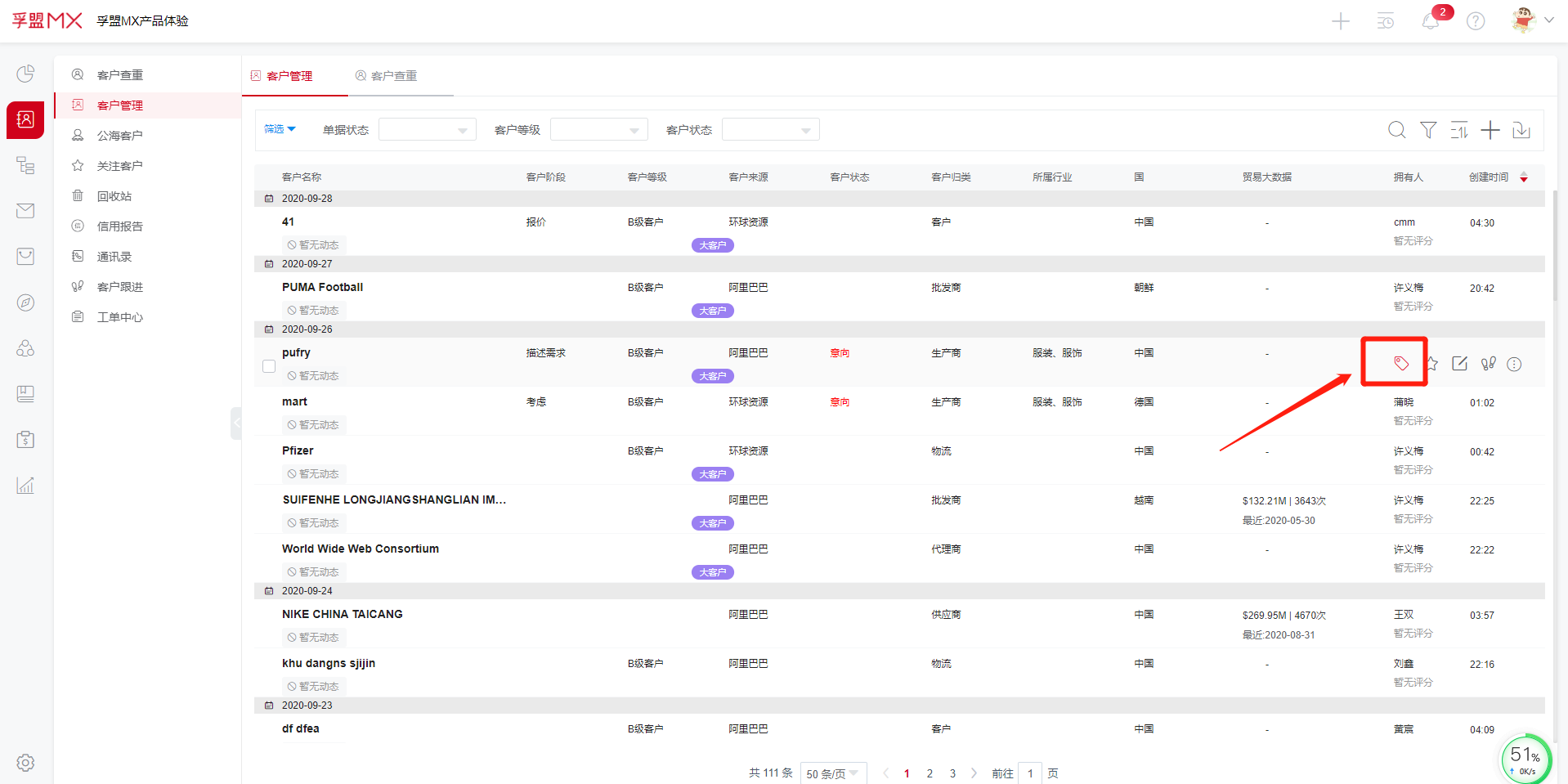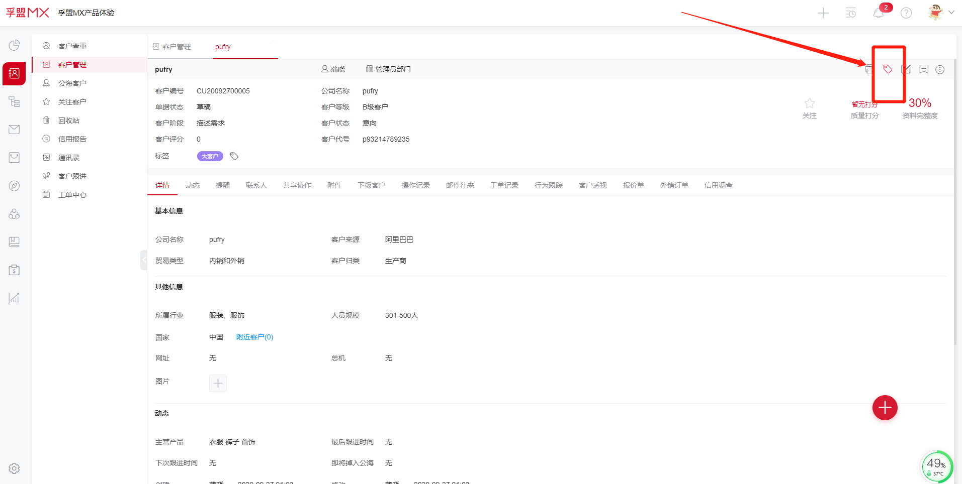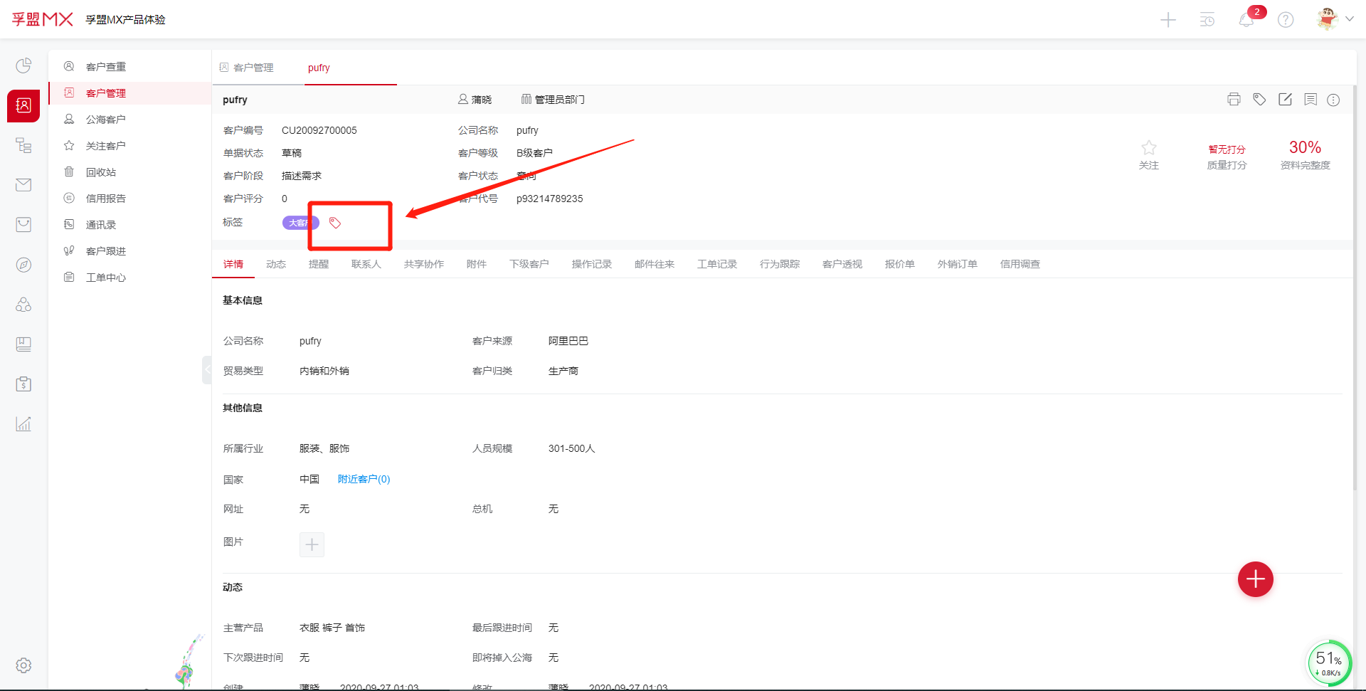 可直接在该条客户信息后面直接点击标签,也可双击该客户名称,在该客户详细信息里去添加标签。还可以 先勾选该客户,点击页面下方的标签进行添加