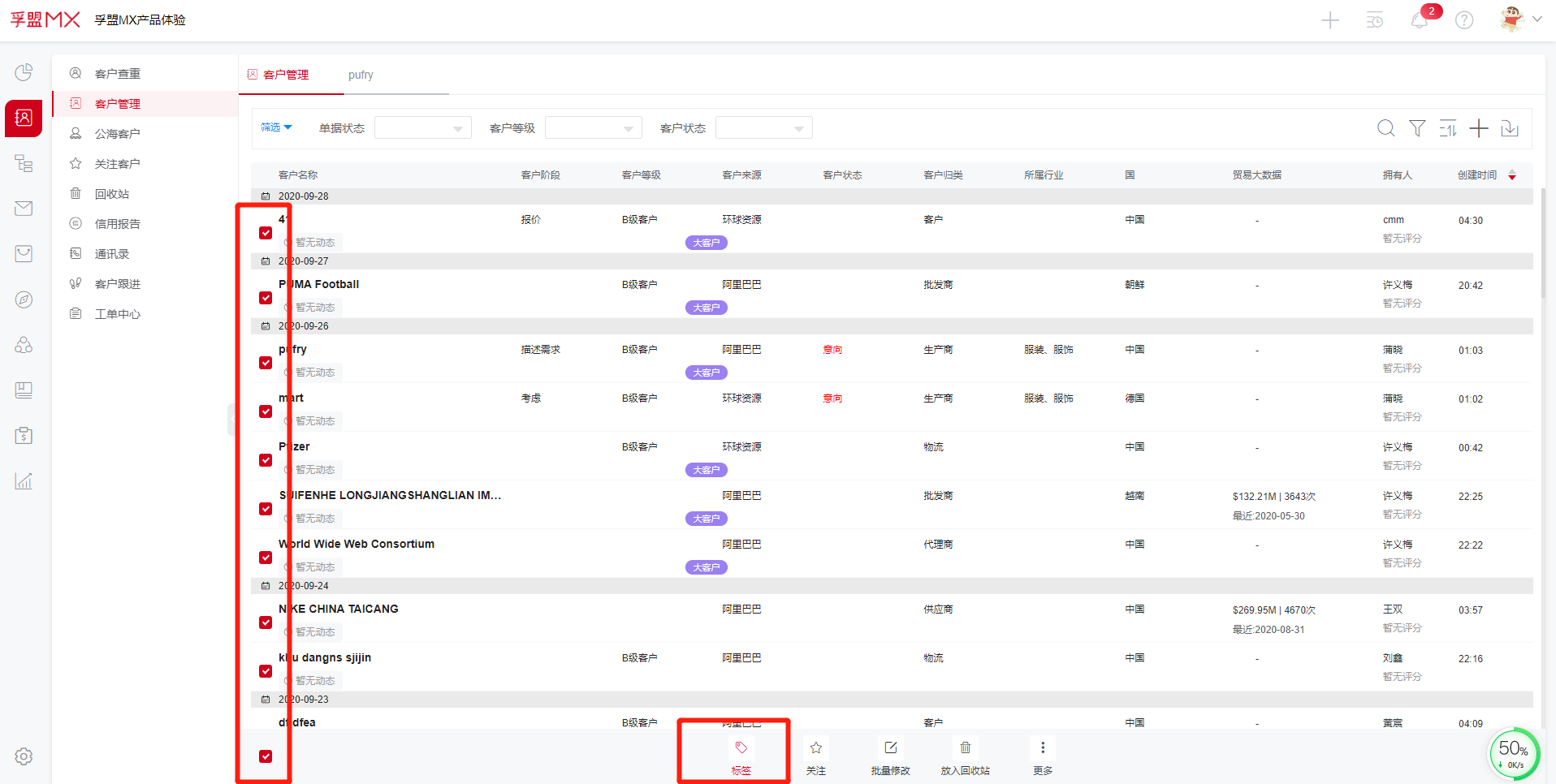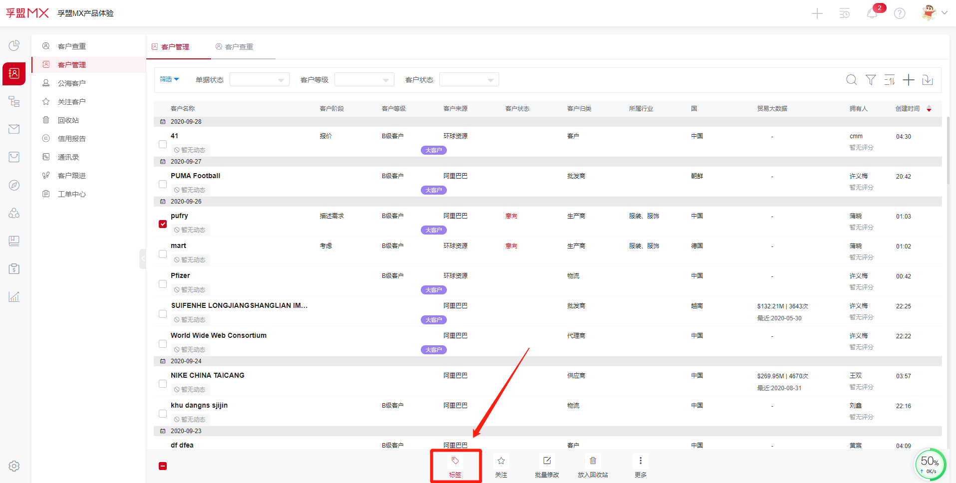 先勾选需要添加标签的客户,点击页面下方的标签进行添加