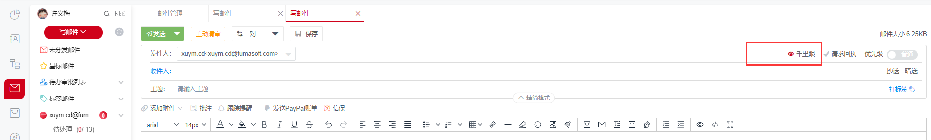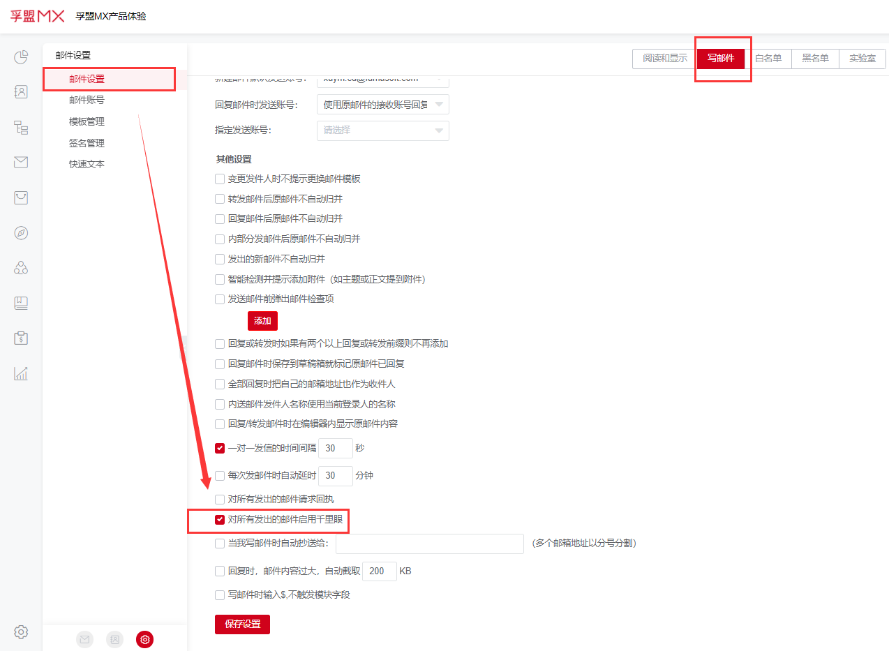 1、邮件设置中勾选对所有发出的邮件启用千里眼