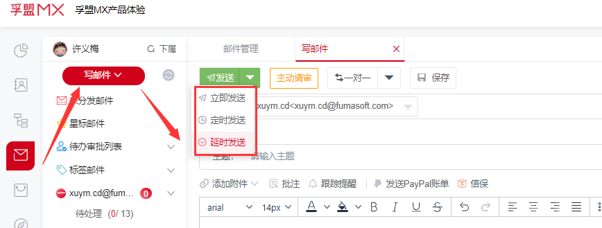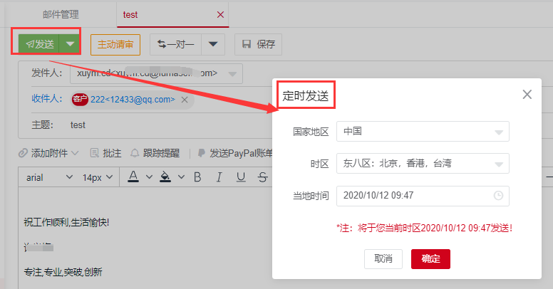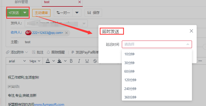 点击定时发送,设置定时发送时间,点击延时发送,设置延时发送时间