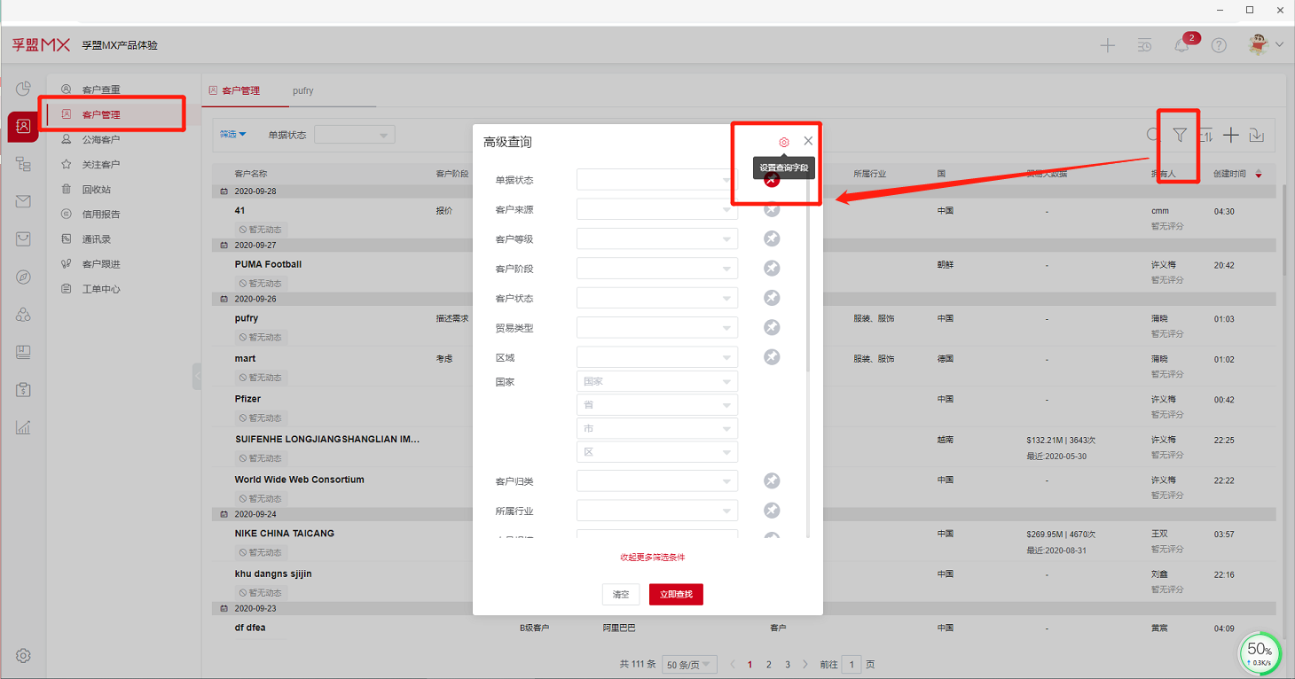 在客户管理模块,点击高级查询,设置查询字段(启用后显示在筛选窗口,置顶后显示在列表管理顶端,最多支持5个置顶)