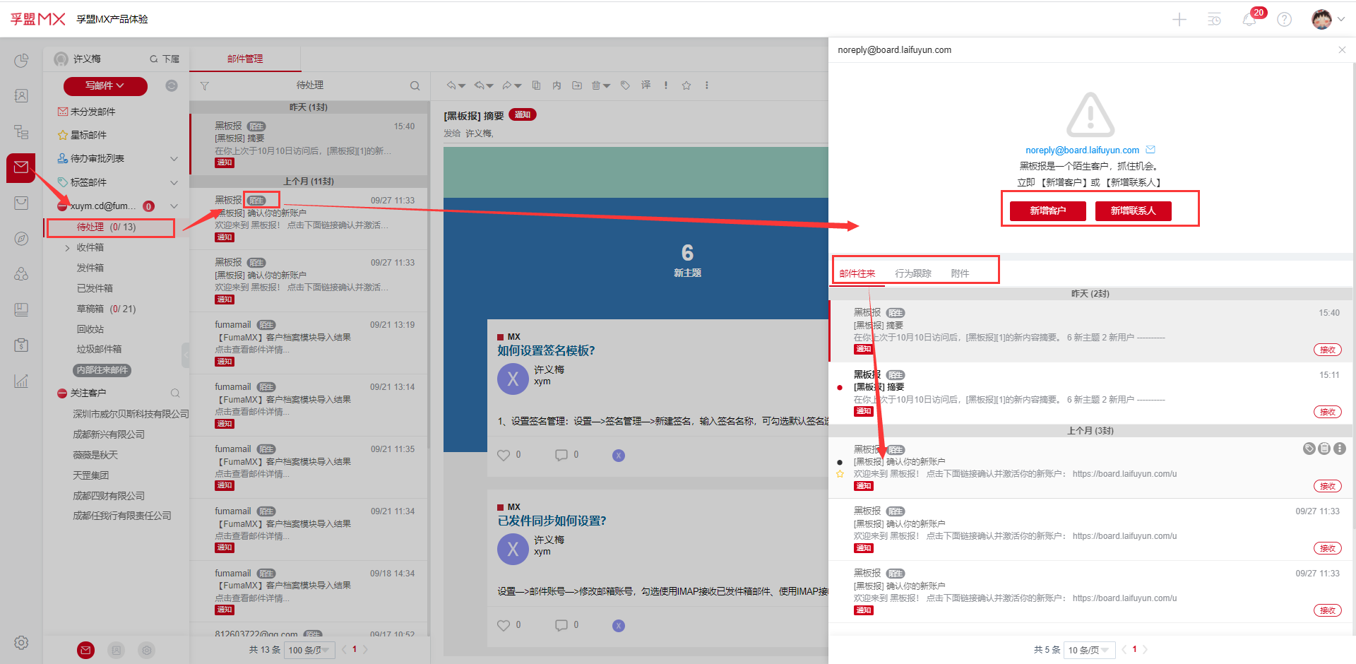 邮件列表会有标签显示该封邮件是陌生的还是客户的,单击此标签会弹出查看邮件往来、客户行为追踪、附件等信息,也可针对陌生客户建档,单击邮件往来按钮,可查看与客户所有的邮件往来信息,方便查找分析,邮件和客户的完美结合,有效管理客户资源。