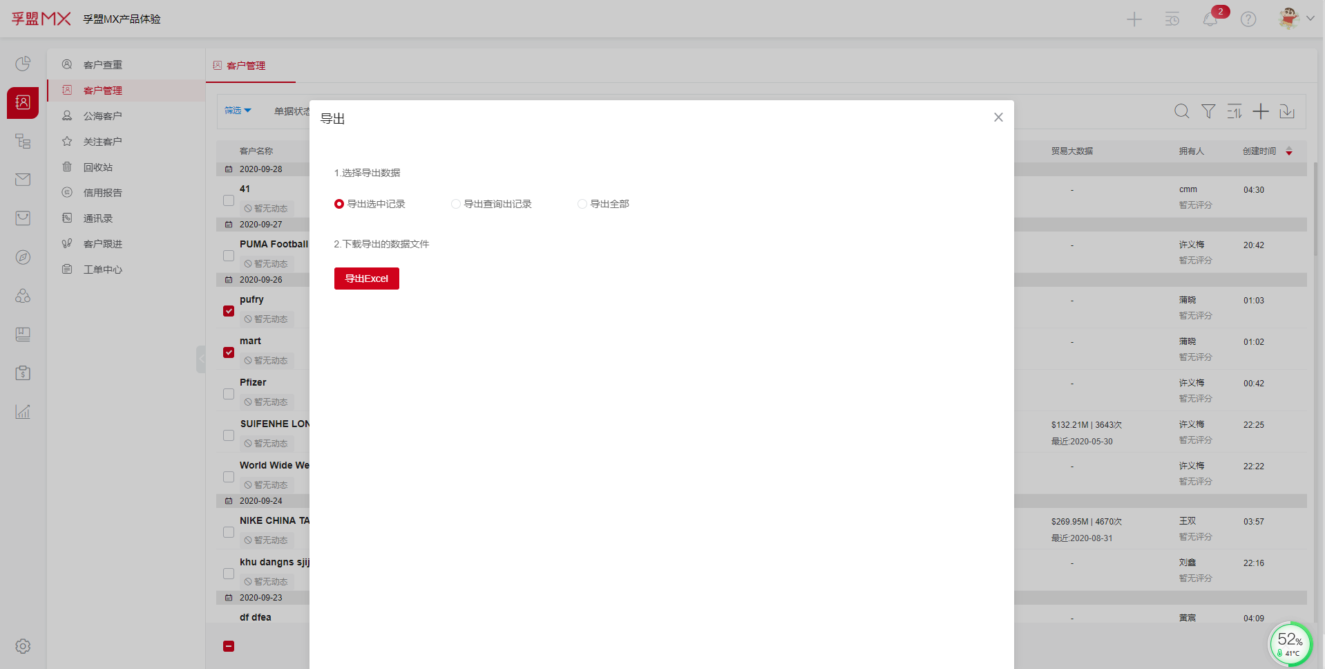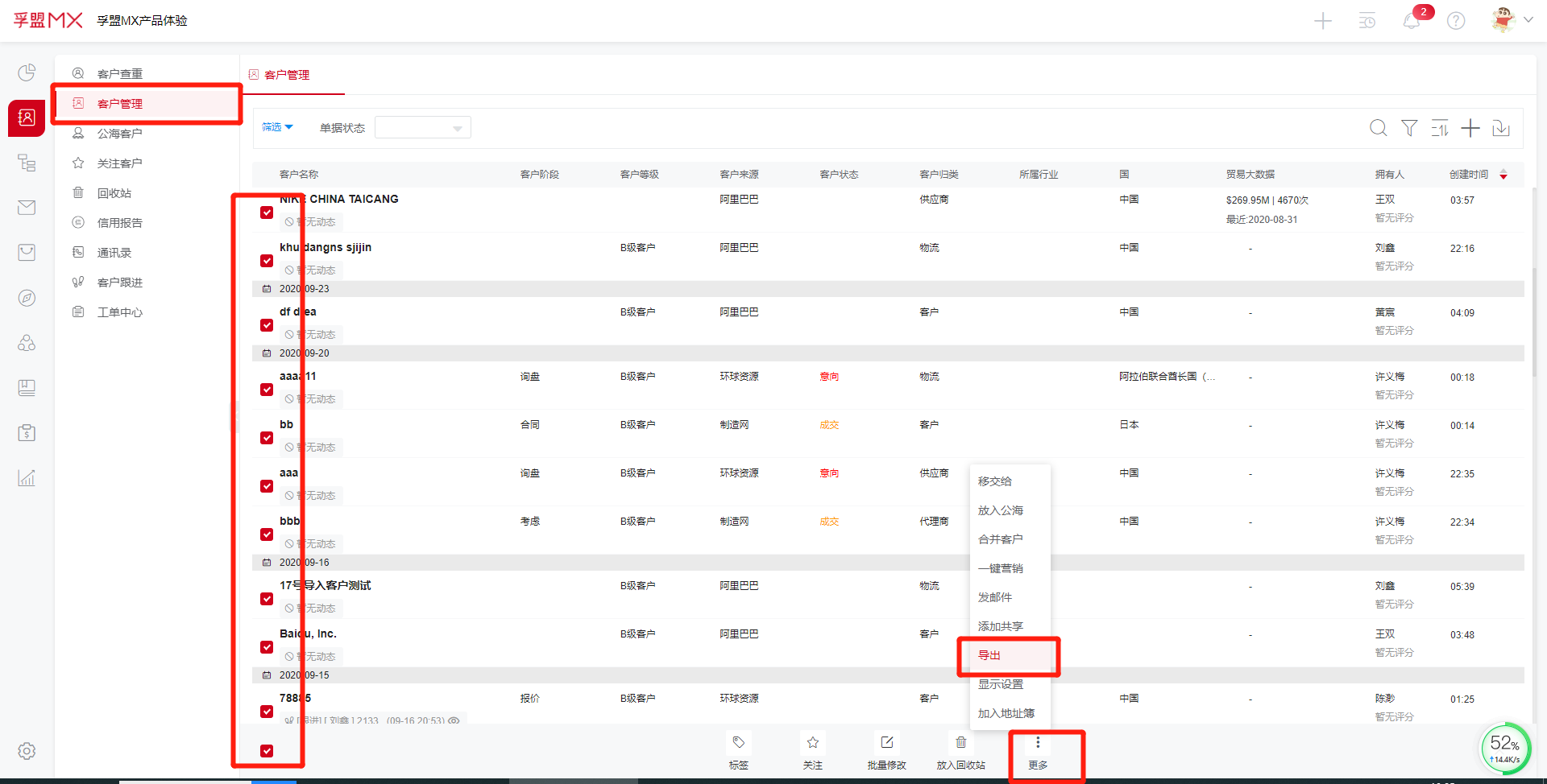在客户管理模块,先勾选需要导出的客户,点击下方的更多里的导出