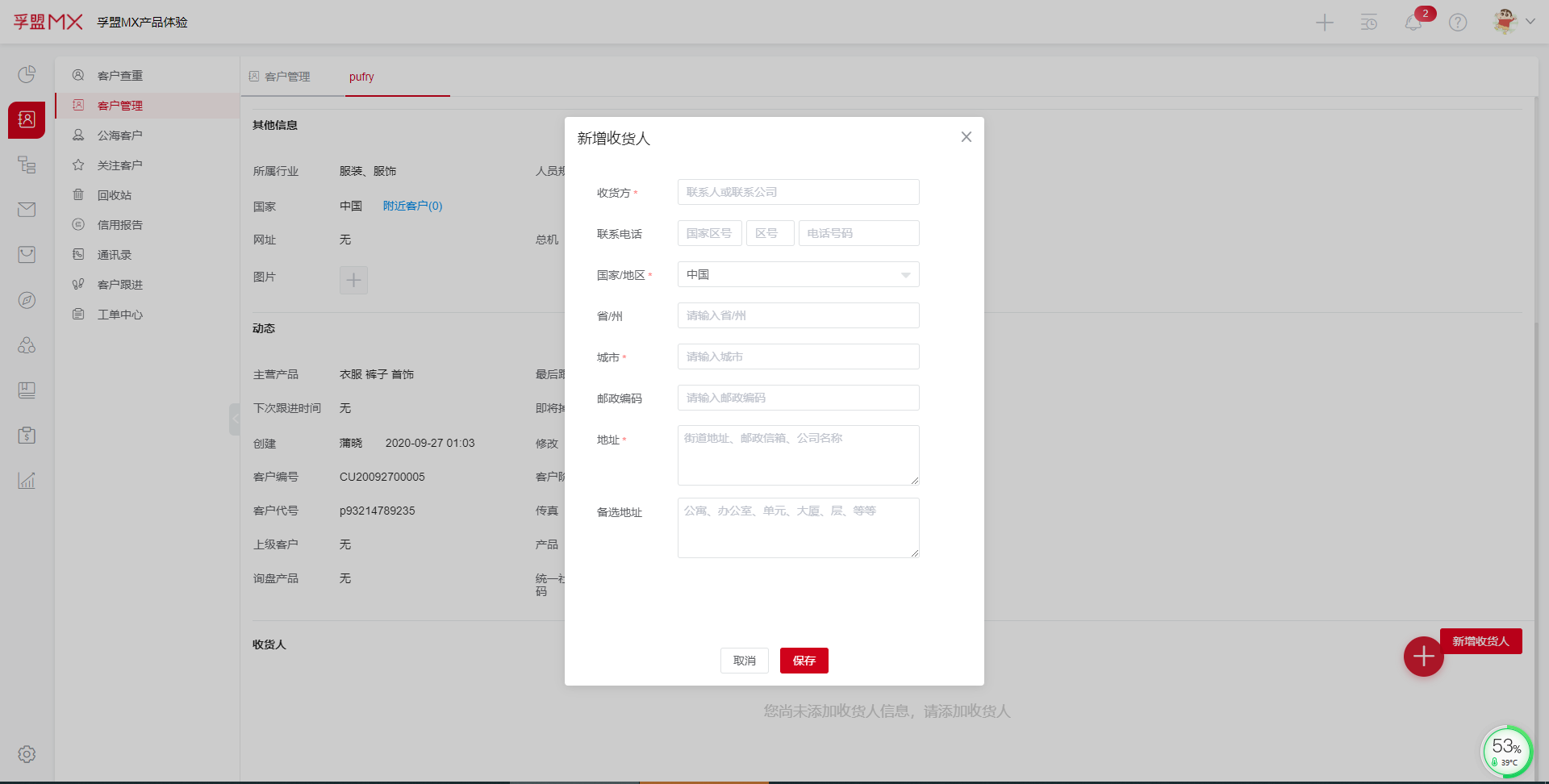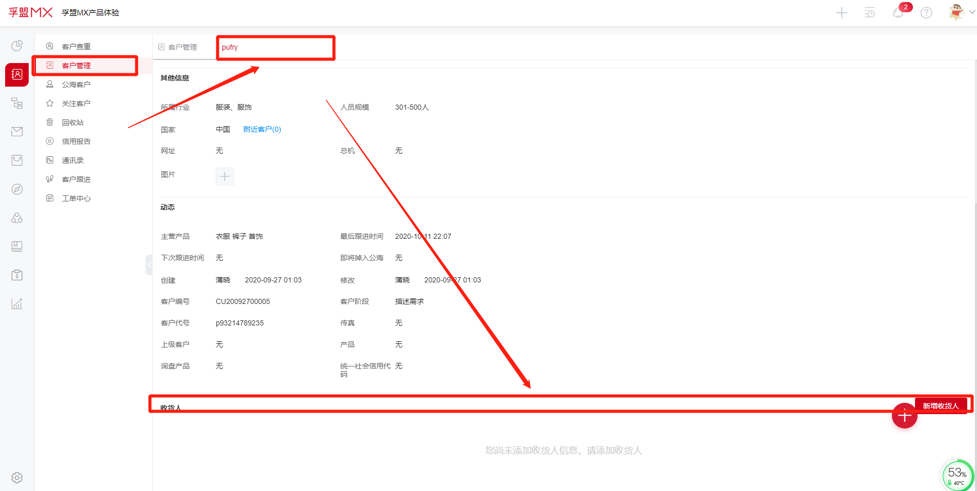 在客户管理模块,点击客户名称进入客户具体相关信息,最下方的收件人,可以新增收货人。